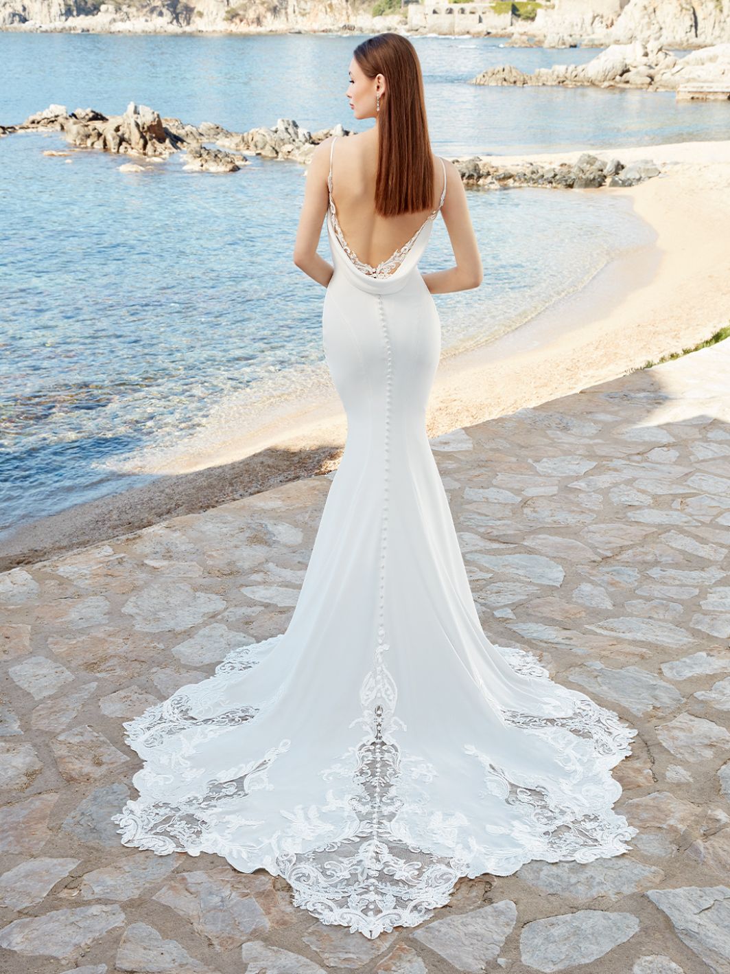 The low cowl neck back with subtle embellishment and plunging bodice exudes effortless romance and flatters many shapes and sizes. The sleek silhouette is finished with a sweeping train featuring a stunning scalloped lace cutout effect.