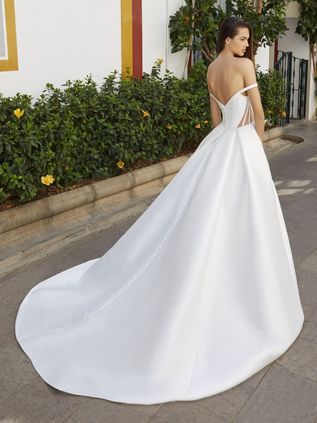 Introducing Beverly, a lightweight matte Mikado gown that embodies simplicity with a bold statement. This stunning dress features a regal, full circle A-line skirt, beautifully enhanced by delicate buttons cascading down the back, adding dimension and elegance.