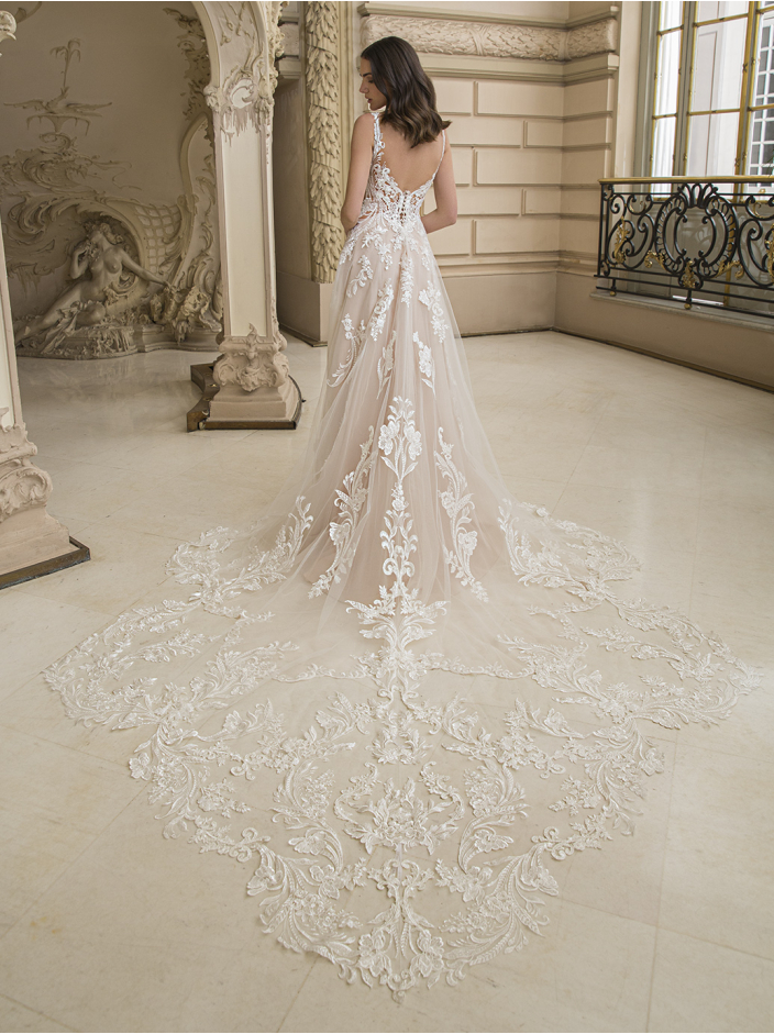 Introducing the Charlemagne wedding dress—a sophisticated A-line gown designed to captivate. This stunning beauty features a sexy plunging neckline and a breathtaking double-sculpted train that will leave everyone in awe.