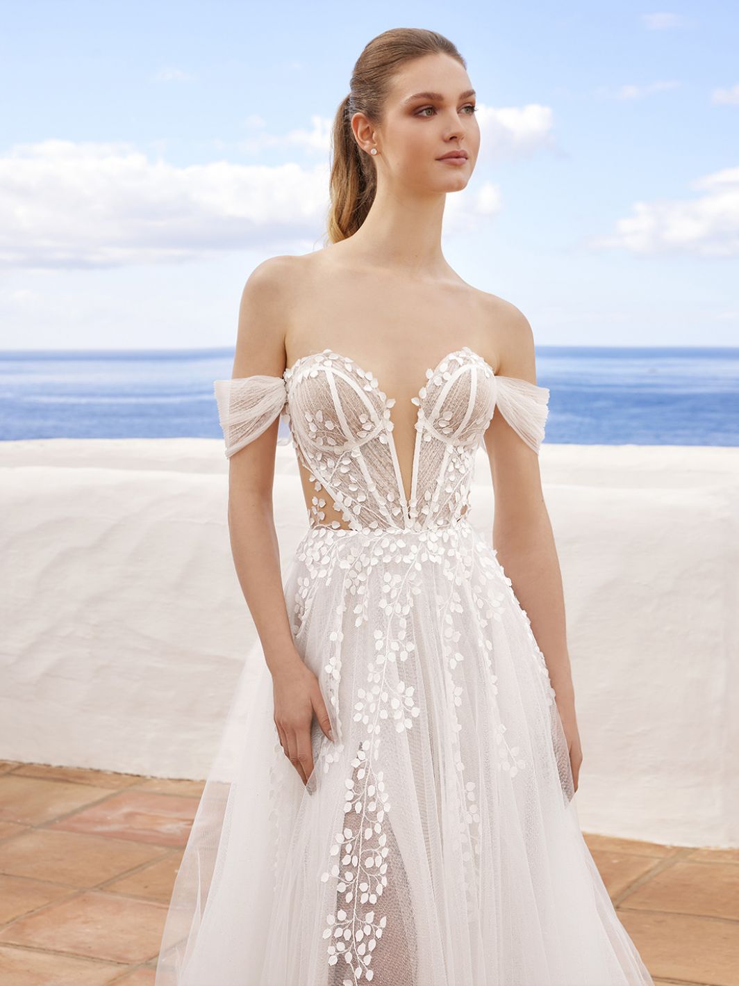 CLAIRE is perfect for dreamy romantics, with its ethereal A-line silhouette and plunging sweetheart neckline. This enchanting wedding dress features intricate 3D floral motifs and embroidered lace on sparkly glitter tulle.