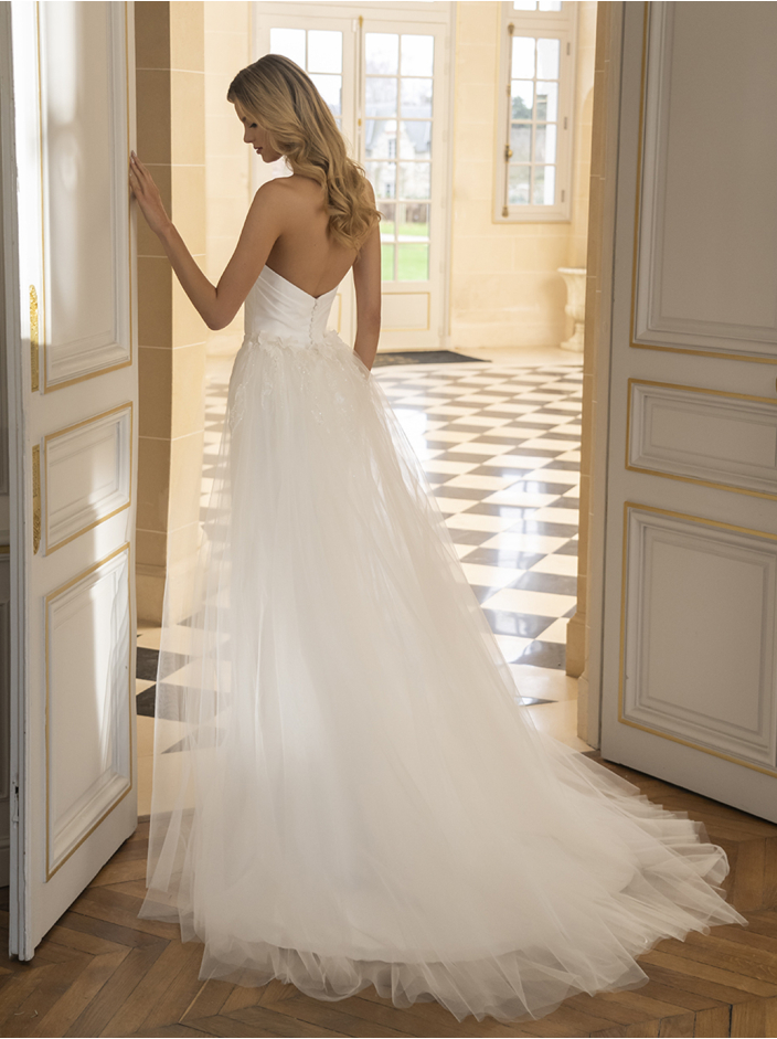 Esmarie features a modern sculpted neckline and a draped crepe bodice that exudes sophistication. Adding a playful touch, the detachable tulle overskirt showcases exquisite 3D Mikado and organza floral appliqués embellishing the back waistline.