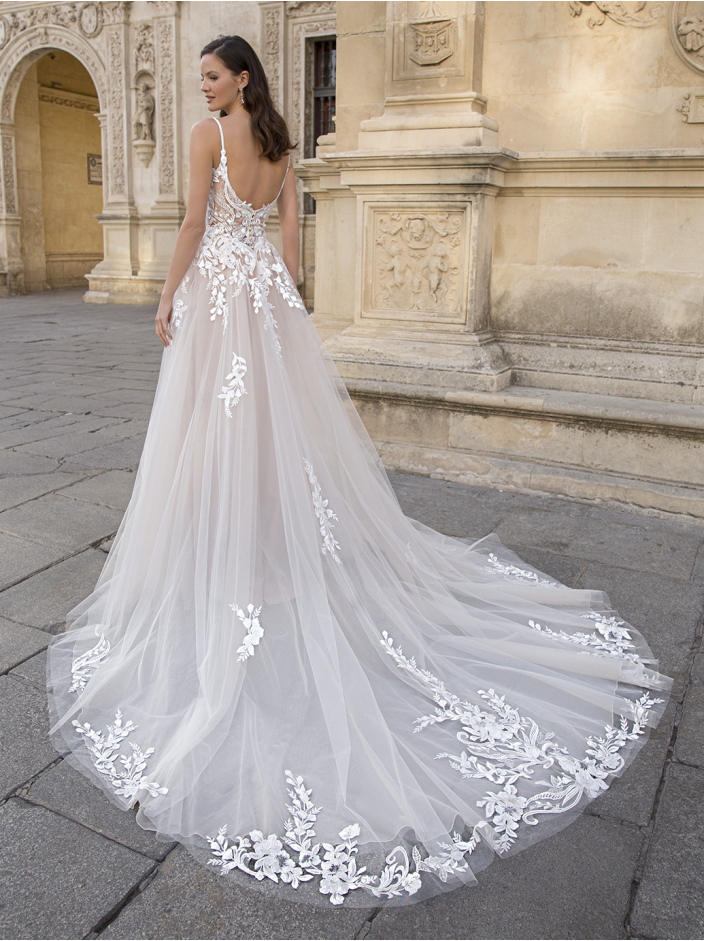 Introducing the Fayette wedding dress—where fairytale dreams come to life! This soft and flirty A-line gown features a deep V-neckline adorned with twinkling beaded straps and a sexy plunging back that is sure to turn heads.
