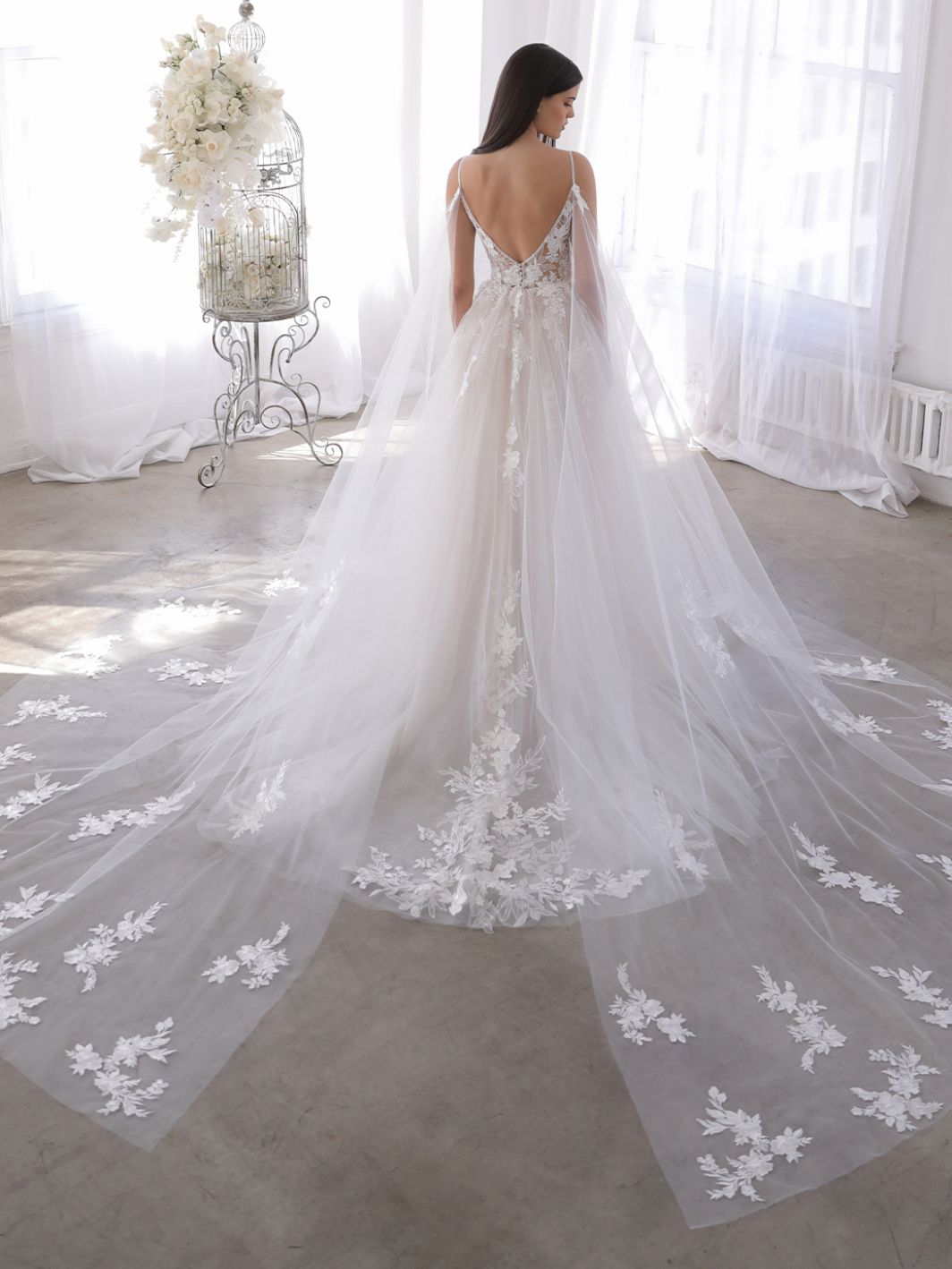 The gown has a deep sweetheart neckline, delicate spaghetti straps, and a low, open V-back. You can complete the look with a matching detachable off-shoulder split cape for extra charm.
