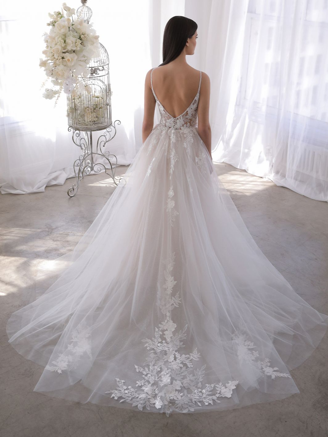 Blue by Enzoani OLEESA is a fairytale-inspired A-line gown that exudes romance. It features floral embroidered lace over shimmering glitter tulle and soft organza, flowing into a dreamy skirt with lace appliqués.