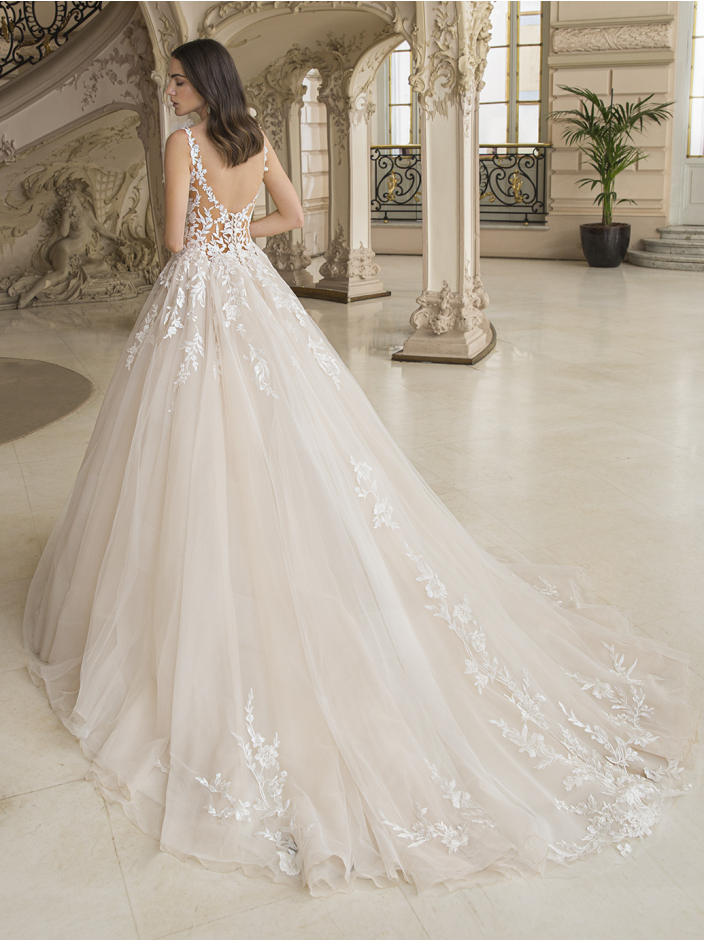The body-contouring side cut-outs enhance the silhouette, while the floral and botanical lace flows into a soft A-line tulle skirt, creating a super-romantic wedding day look.