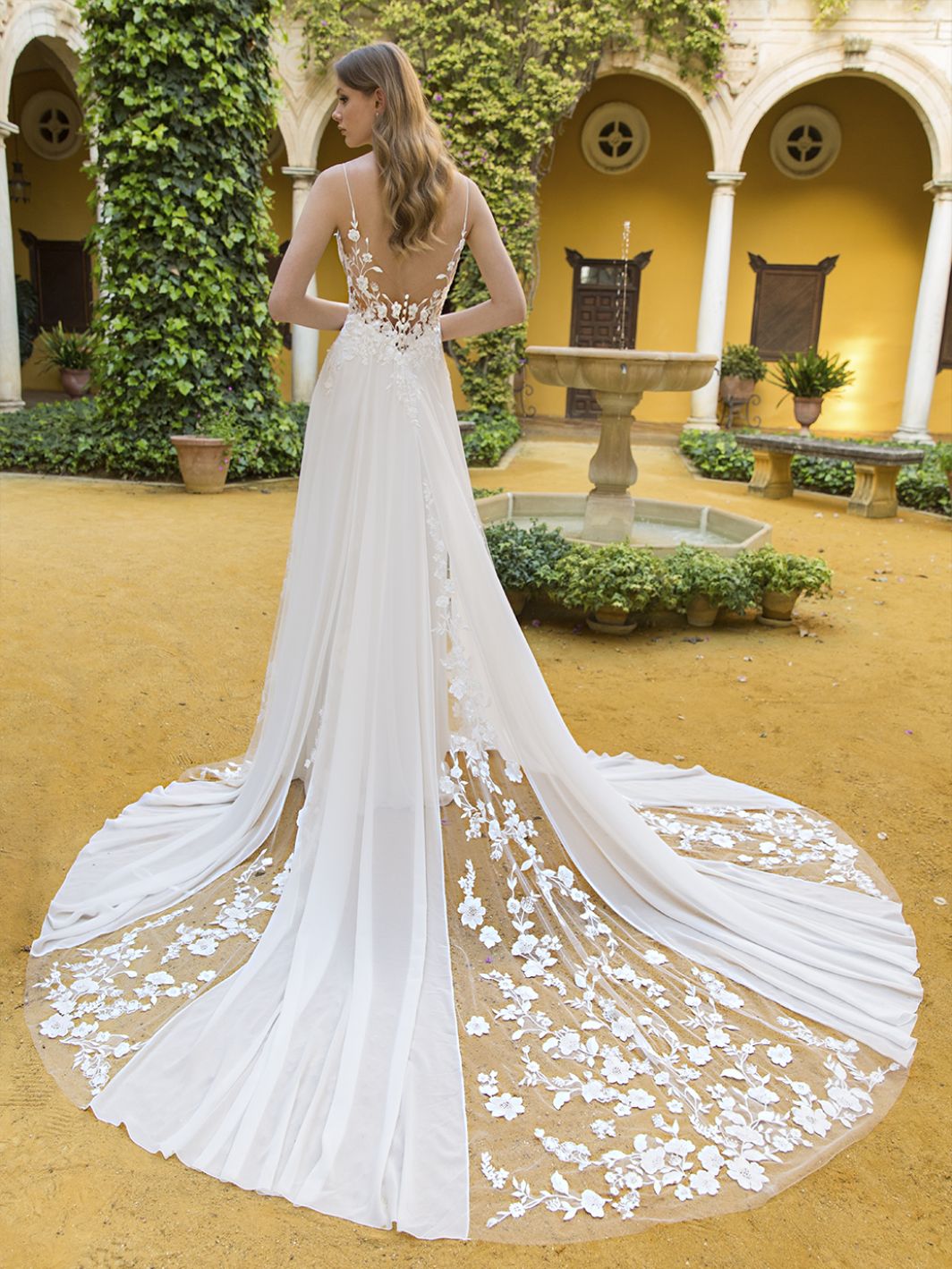 This stunning wedding dress combines intricate laser-cut lace and embroidered wild flowers, with a stunning, flowing train that adds a touch of glamour.