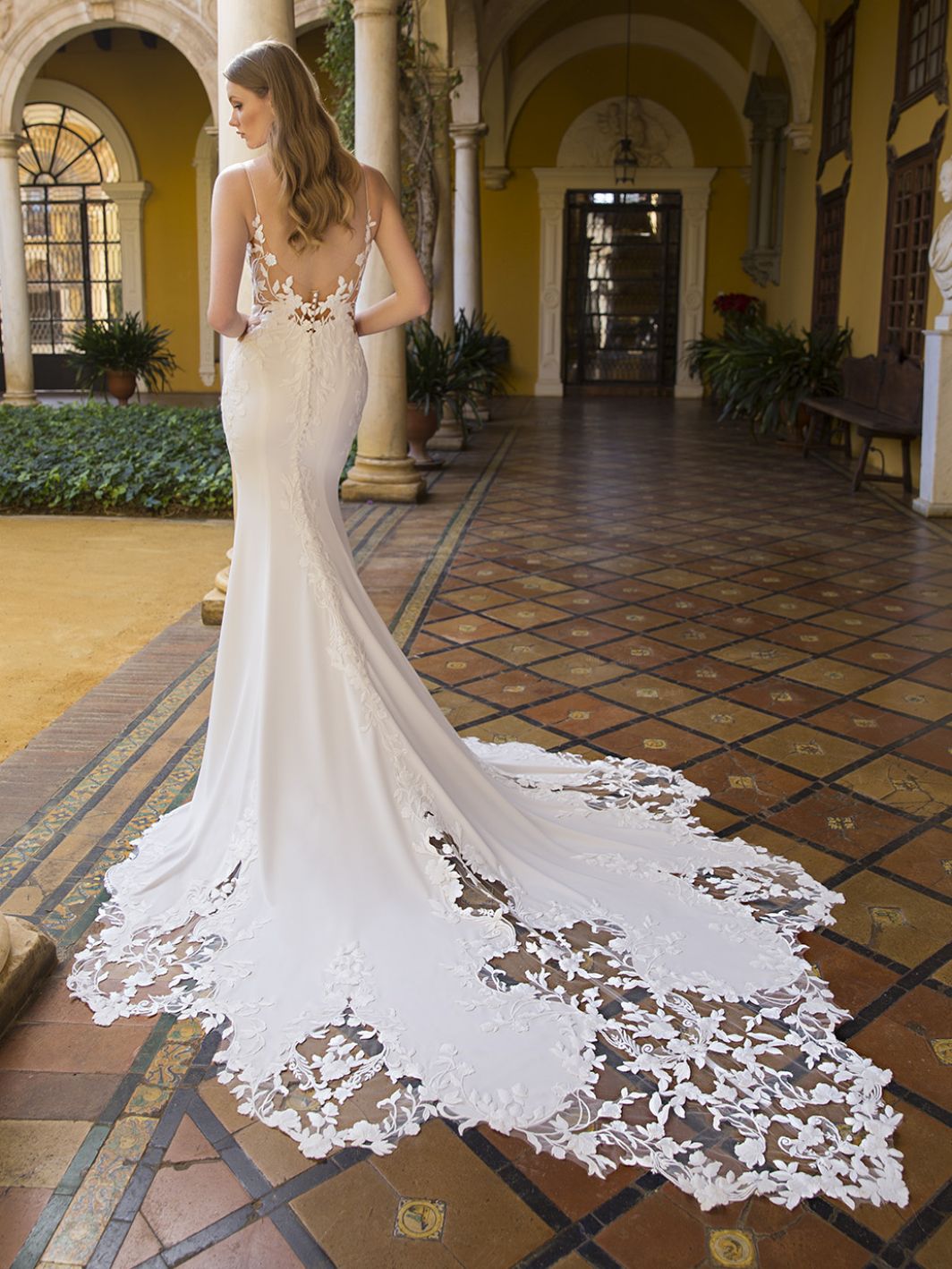 Blue by Enzoani PRINCESS is an elegant sheath-style wedding dress that exudes modern beauty. It features intricate bespoke floral lace that flows from the romantic V-plunge illusion neckline to a stunning corset-style bodice and low illusion back.