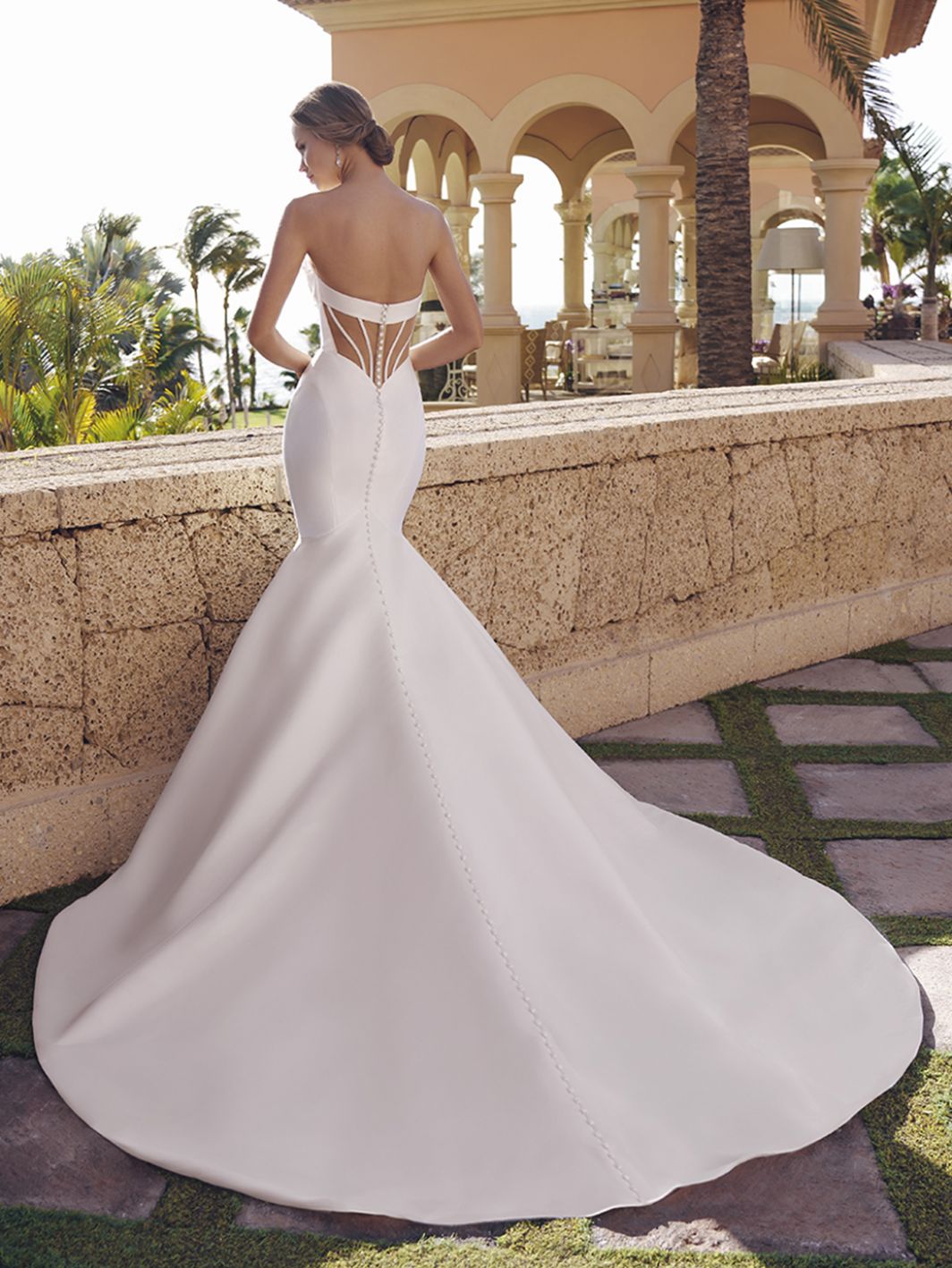 Introducing the Sally wedding dress from Blue by Enzoani—a sleek and breathtaking mermaid gown available in luxurious Mikado or satin.